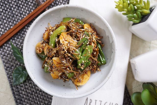 마른 멸치, 고추장, 마늘, 참깨, 간장, 참기름, 식용유, 설탕 으로 만든다. 먼저 멸치는 뜨거운 식용유에 바삭해질 때까지 볶아준다. 고추장은 간장, 마늘, 설탕, 물과 섞어주고, 양념 혼합물을 같은 프라이팬에서 거품이 날 때까지 부드럽게 저어준다. 멸치를 양념과 잘 섞일 때까지 버무려주고, 마지막으로 참기름과 참깨를 추가하여 완성한다. 멸치볶음은 뜨겁게 또는 차갑게 반찬으로 제공할 수 있다. 모든 한국 가정에는 자신만의 레시피가 있으며, 칼슘의 훌륭한 공급원이기 때문에 도시락에서 자주 찾아볼 수 있다.