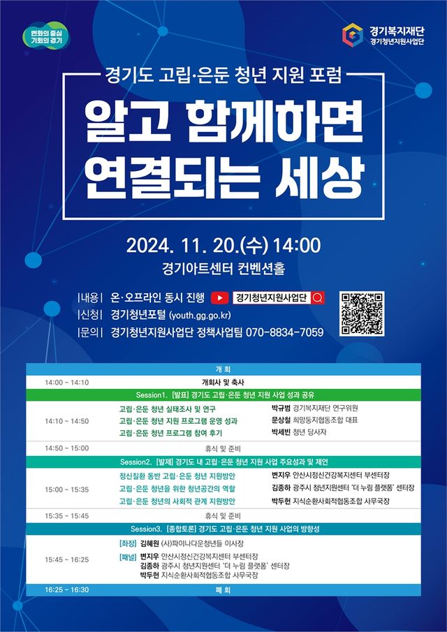 이인용 경기도 청년기회과장은 “고립·은둔 청년 문제는 개인의 문제가 아니라 사회가 함께 해결해야 할 과제”라며 “포럼에서 나온 의견들을 정책에 반영해 고립·은둔 청년의 일상 회복과 자립을 돕겠다”고 밝혔다.