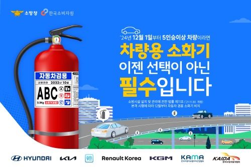 소방시설 설치 및 관리에 관한 법률 개정에 따라 내달 1일부터 차량용 소화기 의무설치 대상 차종이 5인승 이상의 모든 차량으로 확대한다.