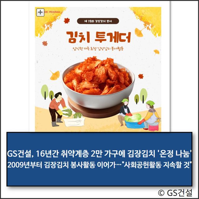 GS건설은 사회공헌의 일환으로 지난 2009년부터 남촌재단과 꾸준히 김장김치 나눔 봉사활동을 이어오고 있다. 취약계층 아동의 가정에 안전한 먹거리 지원을 통해 사회적 가치를 실현하고자 시작된 이 봉사활동은 햇수로 16년차에 접어든 올해까지 누적 2만 가구를 달성했다.