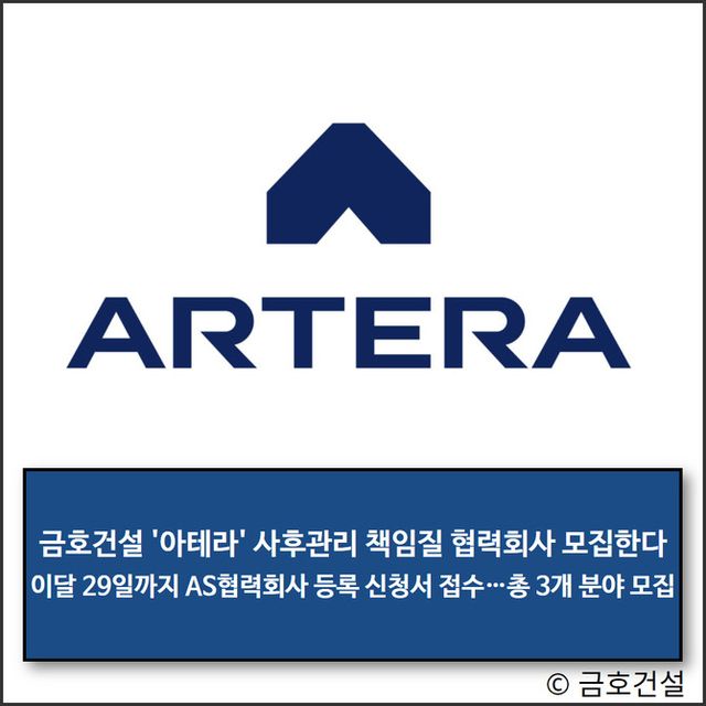 금호건설(002990)이 '아테라' 단지들의 성공적인 입주를 지원하고 최상의 사후관리 서비스(AS·After Service)를 제공하기 위한 협력회사를 모집한다.