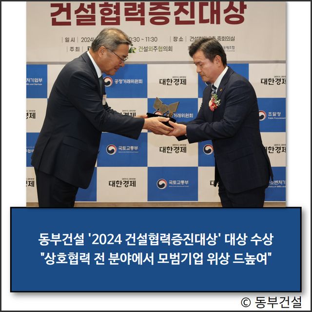 동부건설은 국토교통부 상호협력평가 최우수 등급과 함께 동반성장위원회에서 실시한 동반성장 지수평가에서도 5년 연속 우수 기업으로 선정돼 상생협력 분야의 모범기업으로 그 위상을 지켜내고 있다고 평가받고 있다.
