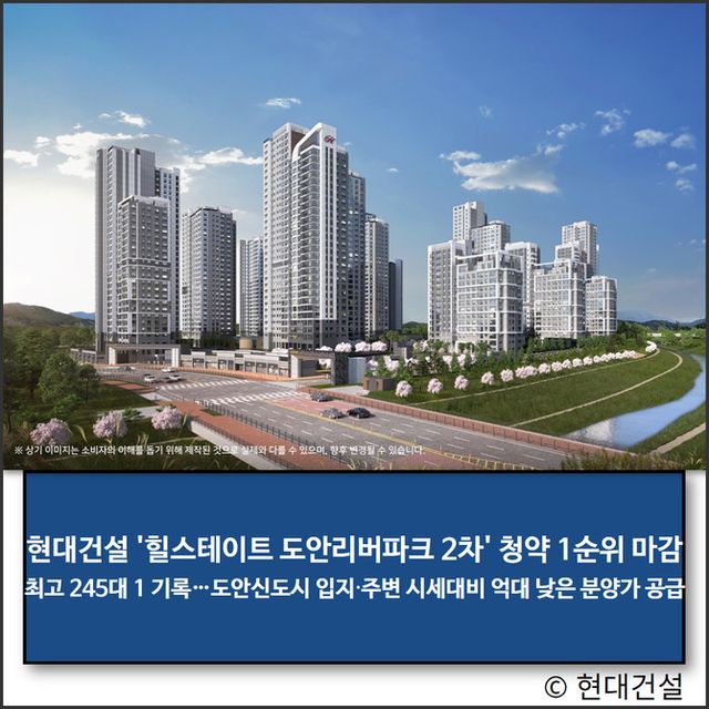 현대건설(000720)이 대전 유성구 일원에 선보인 '힐스테이트 도안리버파크 2차'가 1순위 청약 접수 결과 최고 245대1의 경쟁률을 기록했다.