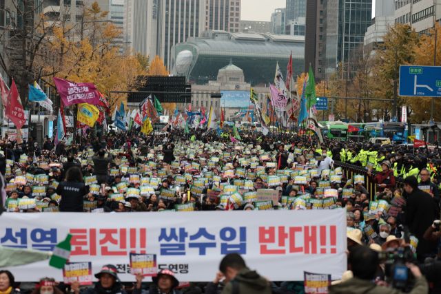 농민들이 서울 도심에서 "쌀값 폭락에도 무대책으로 일관하고 농산물 수입을 확대해 농민을 말살하고 있다"며 윤석열 대통령의 퇴진을 촉구하는 집회를 열었다.