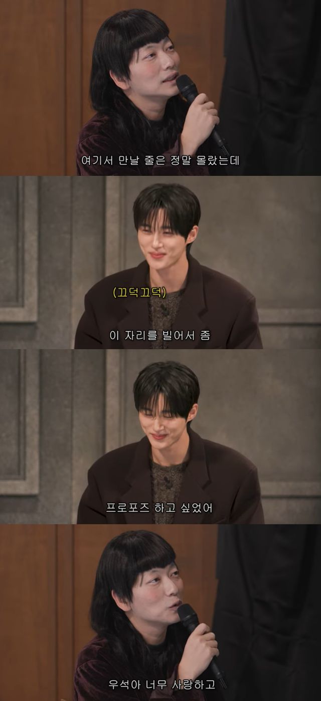 이어 이동휘는 "형도 여기 왜 와 있는지 사실 모르겠다. 근데 너무 축하하는 마음에 함께 하고 싶었다"고 변우석의 생일을 축하하더니 "곧 '매소드연기'라는 영화 개봉하면 꼭 그날 너가 와주길 바래서 이 자리를 빌어서 좀 프로포즈 하고 싶었다"고 말했다.