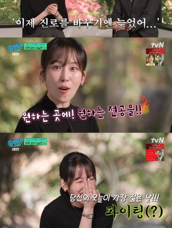 유재석은 "어떠셨냐. 데뷔 이후 공백기가 중간중간 생기다 보니까 본인 스스로 이 길에 들어선 걸 후회한다거나"라며 관심을 나타냈고, 서현진은 "후회 많이 했다. 지금 생각하면 진짜 어린 나이다. 스물넷, 스물일곱. 다른 걸 시작해도 충분히 할 수 있는데 그땐 늦었다고 생각했다. '나 이제 진로를 바꾸기엔 늦었어' 했다. 너무 예체능으로만 4살 때부터 쭉 있었으니까 다른 일 하기가 엄두가 안 났다. 지금의 스물넷, 스물일곱 여러분들은 늦지 않았다. 지금이라도 원하는 곳에 원하는 전공을. 당신의 지금이 가장 젊은 날이다. 파이팅"이라며 응원했다.