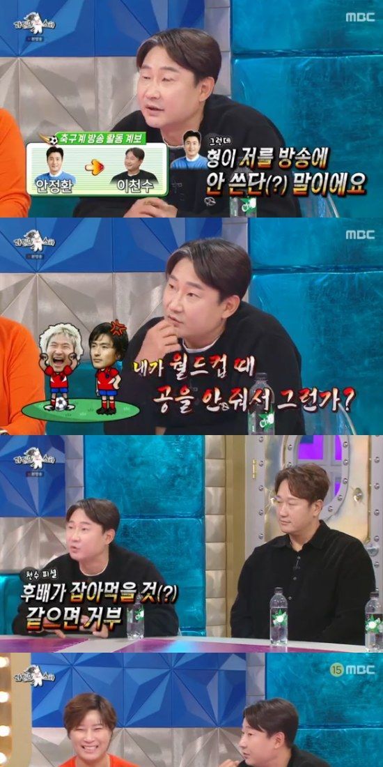 이날 이천수는 예능에서 활발하게 활동하고 있는 안정환을 언급하면서 "정환이 형이 방송 패턴이 있다. 방송을 안하는 후배와 함께 하더라. 그런데 저는 안 불렀다"고 말했다.