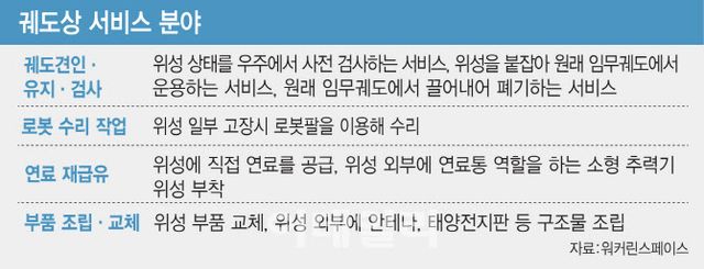 시장조사기업 ‘마케츠앤마케츠(MarketsandMarkets) 2023’ 보고서에 따르면 궤도상 서비싱 시장은 약 7조원 규모로 성장할 것으로 예상된다. 국제우주쓰레기조정위원회(IADC)에서 지구 주위 궤도 보호영역이 설정되고, 국제연합(UN) 등에서 가이드라인을 마련했다. 우리나라에서는 과학기술정보통신부가 우주쓰레기를 줄이기 위한 권고안을 마련하는 등 한정된 지구 주위 궤도영역을 보호하기 위한 국내외 규제가 갈수록 강화되는 추세다. 이 같은 여건 속에 민간기업들이 성장하면서 우주에서도 항공기 급유처럼 견인, 재급유, 부품 수리·교체 시대가 도래해 2029년께 상업시장이 본격화될 전망이다.