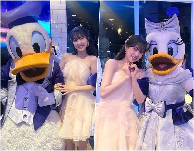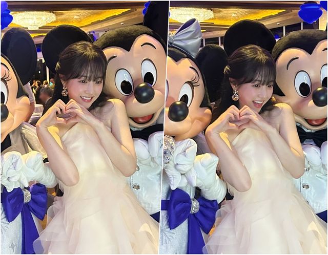 사진 속 박보영은 화사한 살구빛의 드레스를 입고 디즈니의 캐릭터인 미니마우스와 미키마우스 사이에서 환한 미소를 짓고 있는 모습이다. 박보영 특유의 러블리한 매력과 사랑스러운 캐릭터들이 만나 보기만 해도 미소를 짓게 만드는 것.