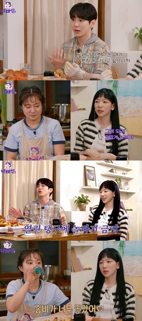 또 박나래는 태연에게 "넌 집에 있으면 뭐 하냐"고 물었고, 태연은 "뭐 안 하고 그냥 있는다. 진짜 노잼 라이프다. 배달 음식 시켜 먹고, 커피 마시고, 그냥 밖에 쳐다보곤 한다"고 말했다.