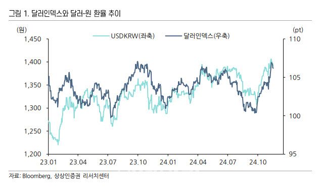 대선 한 달 전부터 트럼프 트레이딩의 일환으로 상승한 달러는 도널드 트럼프 후보의 당선이 확정된 이후 더 강해지면서 글로벌 금융시장 변수로 대두되고 있다. 최 연구원은 “이번 강달러 랠리는 폭과 속도가 상당히 크고 가파른 모습이며 달러 강세로 인해 주요국 통화가치는 약세 흐름이 불가피했다”면서 “특히 원화는 내수 위축, 글로벌 보호무역주의로의 전환 등 대내외적 악재를 소화하며 성장률 전망에 대한 부정적 시각이 높아졌다”고 지적했다. 이에 따라 트럼프발 외환시장 발작에 연고점인 1400원대까지 환율이 오르기도 했다.
