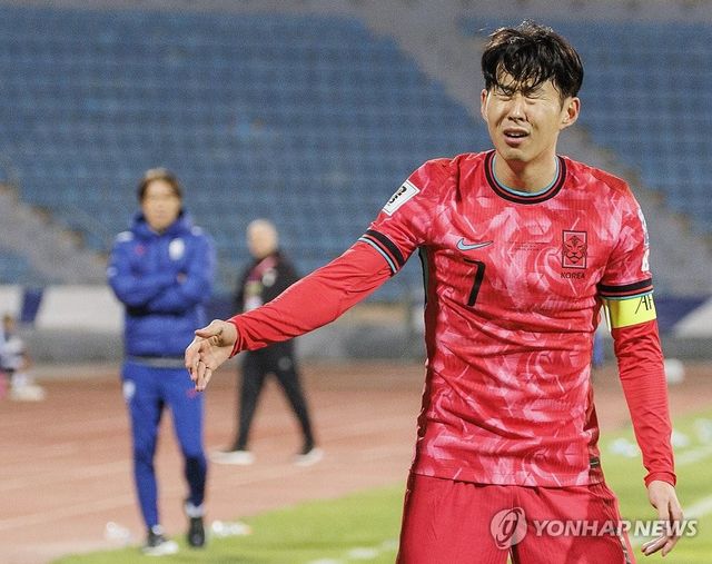 19일 오후(현지 시각) 요르단 암만 국제경기장에서 열린 2026 북중미 월드컵 아시아 3차 예선 B조 한국과 팔레스타인의 경기. 한국의 손흥민이 선심의 판정에 아쉬워하고 있다. / 연합뉴스