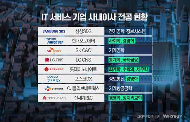 신세계I&C 역시 크게 다르지 않다. 지난달 30일 자리에서 물러난 형태준 신세계I&C 전 대표는 경영학을 전공했으며, 한훈민 신세계I&C 상무는 정치외교학을 졸업했다. 서용린 신세계I&C 담당도 경영학을 전공했다. 이밖에 현신균 LG CNS 대표는 통계학 박사 과정을 거쳤다.