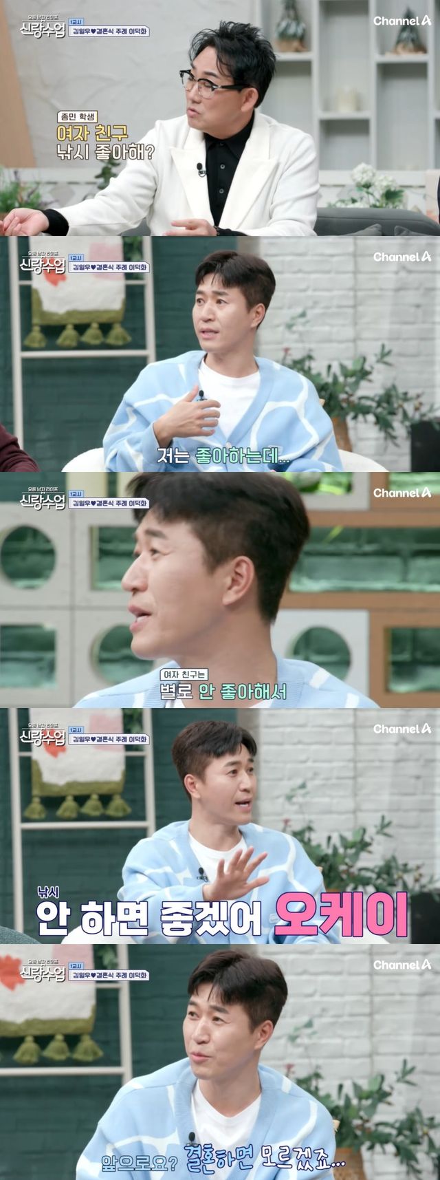 여자친구가 낚시를 좋아하냐는 질문에 김종민은 "저는 좋아하는데 낚시하는 걸 별로 안 좋아한다. '낚시 안 했으면 좋겠다'길래 오케이 안 하겠다고 했다"고 '사랑꾼' 면모를 드러내더니 "결혼하면 모른다"고 농담을 보였다.