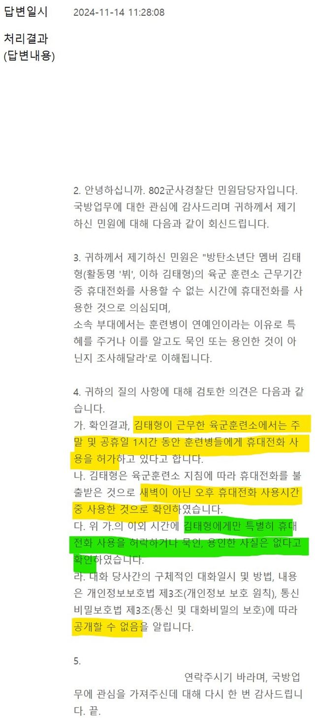 그리고 지난 20일 해당 네티즌은 민희진과 방탄소년단 뷔 문자 민원과 관련한 답변을 받았다는 사실을 알렸다. 그가 공유한 내용에 따르면 "김태형이 근무한 육군 훈련소에서는 주말 및 공휴일 1시간 동안 훈련병들에게 휴대전화 사용을 허가하고 있다"라며 "새벽이 아닌 오후 휴대전화 사용시간 중 사용한 것으로 확인했고, 김태형에게만 특별히 휴대 전화 사용을 허락하거나 묵인, 용인한 사실은 없다고 확인했다"라는 내용이 담겨있다.