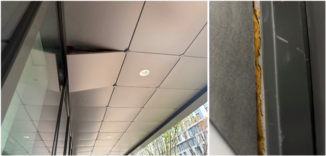 문제는 지하층에만 있는 것이 아니었다. 거주층은 물론이고 상가층까지 크고 작은 하자를 발견할 수 있었다. 지상 상가층에서는 천장이 제대로 시공되지 않아 철판이 떨어지기 일보 직전인 모습을 보였다. 자칫 사람이 지나가다가 머리에 맞는다면 큰 부상을 당할 수 있었다.