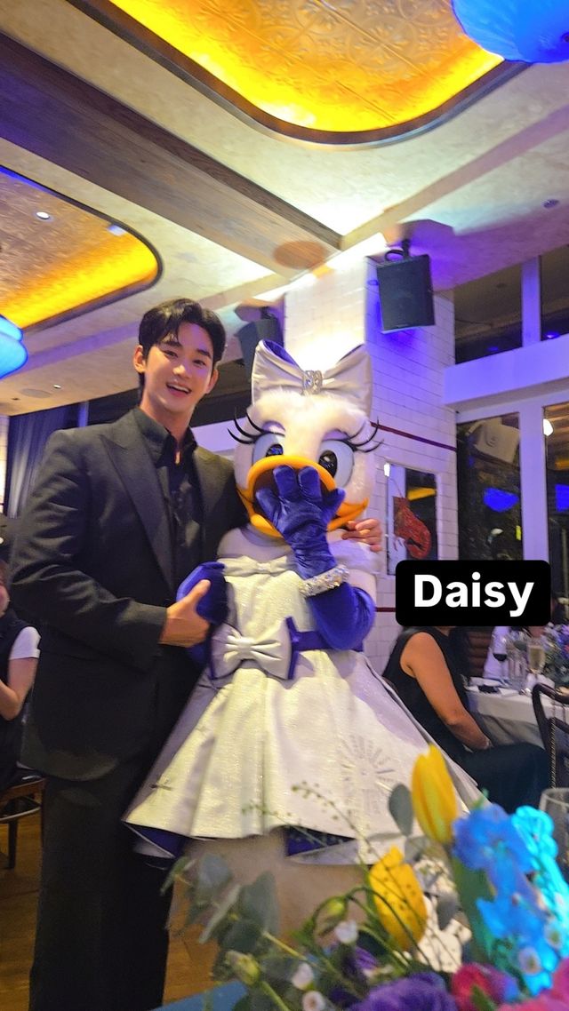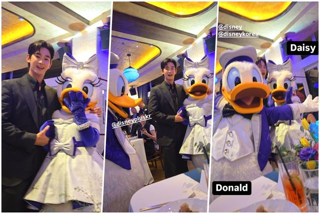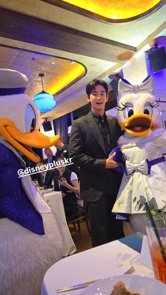 이날 김수현은 미키마우스와 미니마우스 사이에서 인증 사진을 찍었다. 이어 데이지의 어깨에 손을 올리고 손을 잡으며 다정한 모습을 연출했다. 데이지 역시 입에 손을 올리며 수줍은 모습을 숨기지 못했다.