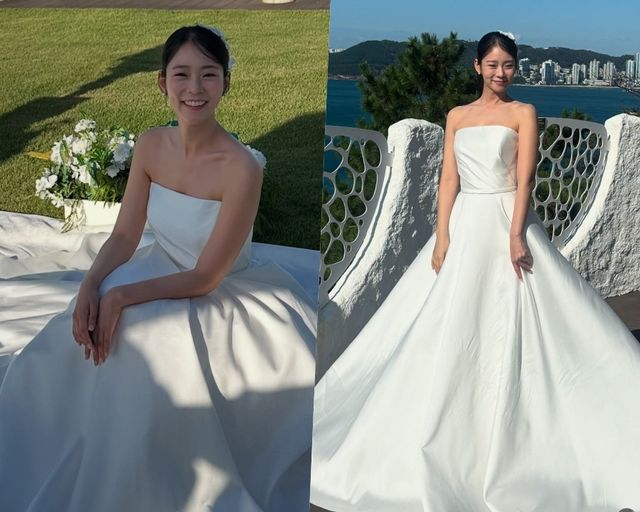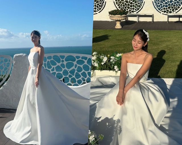 사진 속 한승연은 웨딩드레스를 입고 자연을 배경으로 아름다운 자태를 뽐내고 있다. 실크 재질의 튜브탑 웨딩드레스는 심플한 디자인 속에서 한승연의 아름다운 모습을 더욱 부각시키며 눈길을 끈다.