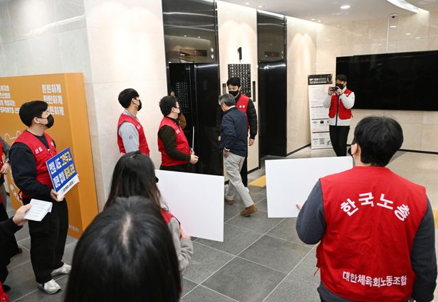 대한체육회노동조합(위원장 김성하)은 21일 오전 10시15분부터 약 20여 분간 이기흥 대한체육회장이 직무정지 상태임에도 집무실에 출근한 것에 대해 출근길 저지 및 규탄을 위한 긴급시위를 벌였다.