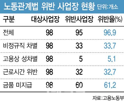 감독 결과 95개 사업장에서 총 535건의 노동관계법 위반 사항이 적발됐다. 고용형태에 따라 이유 없이 차별적 처우를 한 곳이 33곳에 달했다. 기간제·단시간·파견 근로자에게 식대와 명절상여금 등을 지급하지 않거나 정규직 근로자와 차별해 지급하는 식이다. 기간제법과 파견법은 동종·유사업무를 담당하는 근로자를 고용형태에 따라 차별적으로 처우해선 면 안 된다고 규율하고 있다. A 마트와 B사는 금품을 차별 지급해 기간제법을 어긴 사례다.