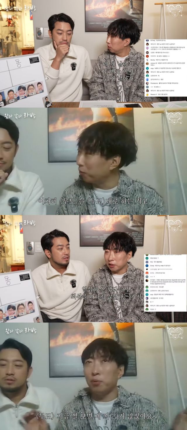 "열심히 하지 않았다"는 박명수의 고백에 침착맨이 지금이라도 시청자들에게 사과를 제안했고, 박명수는 "그래도 노력은 했다. 그리고 그랬기 때문에 지금 '짤'이 많이 돌고 있는 거다. 제 짤이 많다"고 당당히 말했다.