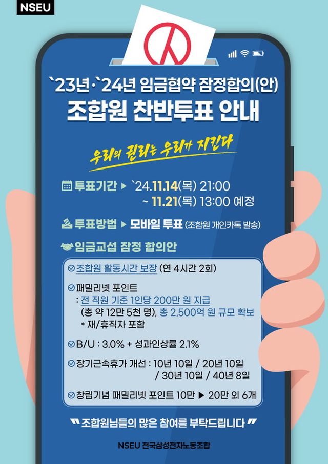앞서 삼성전자 노사는 지난 14일 전 직원에게 자사 제품 구매에 사용할 수 있는 패밀리넷 200만 포인트를 지급하는 데 합의했다. 평균 임금인상률은 5.1%(기본인상률 3%·성과인상률 2.1%)로 정했다.