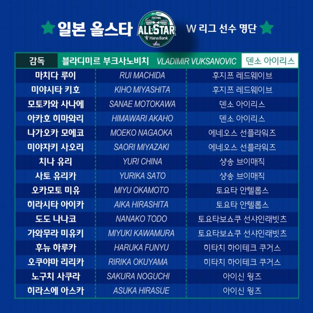 일본 W리그 측에서 선정한 일본 올스타는 W리그 프리미어(1부 리그) 소속 8개 팀에서 각 2명씩 총 16명이 선발됐다.