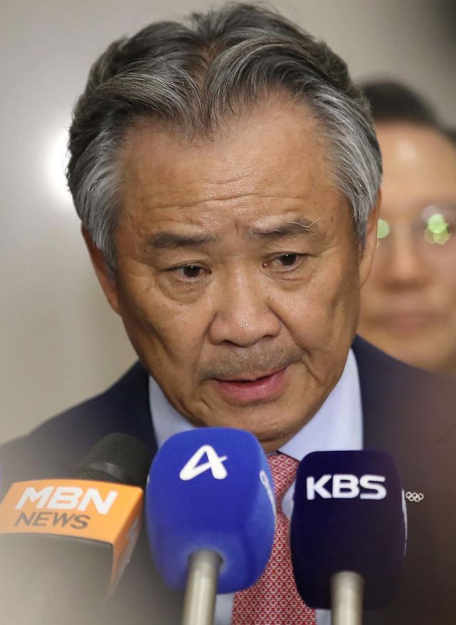 3선 도전의 길이 열린 이기흥 대한체육회장이 세계올림픽도시연합(WUOC) 회의를 마치고 13일 오후 인천국제공항을 통해 귀국해 취재진 질문을 듣고 있다. / 뉴스1