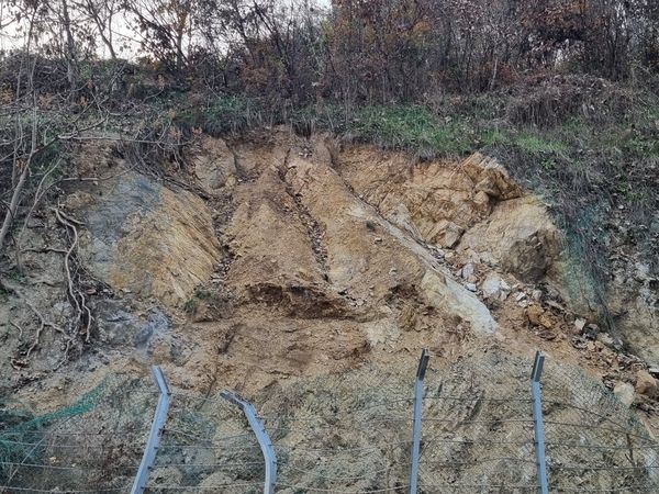 지난 7월부터 약 4개월간 방치돼 있던 매몰 토사로 낙석 방지 펜스가 내려 앉아 있다. 독자 제공