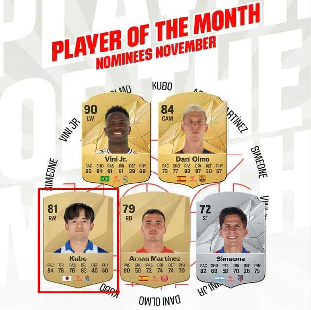 구보는 이제 2024 발롱도르 2위 비니시우스 주니오르(레알 마드리드·1경기 3골), 다니 올모(바르셀로나·3경기 2골), 아르나우 마르티네스(지로나·2경기 1골), 줄리아노 시메오네(아틀레티코 마드리드·2경기 1골1도움)과 이달의 선수를 두고 경쟁을 펼친다.