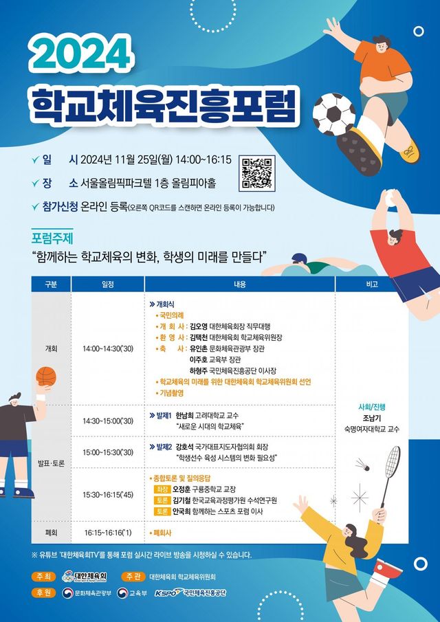 이어지는 첫 번째 발제에서는 한남희 고려대학교 국제스포츠학부 교수가 ‘새로운 시대의 학교체육’이라는 주제로 현재 학교체육의 현황을 진단하고, 구조적 문제와 한계를 바탕으로 새롭게 요구되는 교육환경과 기술 활용을 반영한 실천적 대안을 제시한다.