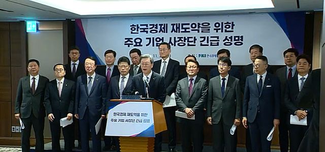 국내 주요 기업 사장단은 오늘(21일) 서울 중구 롯데호텔에서 ‘한국경제 재도약을 위한 주요 기업 사장단 긴급 성명’을 발표했습니다.