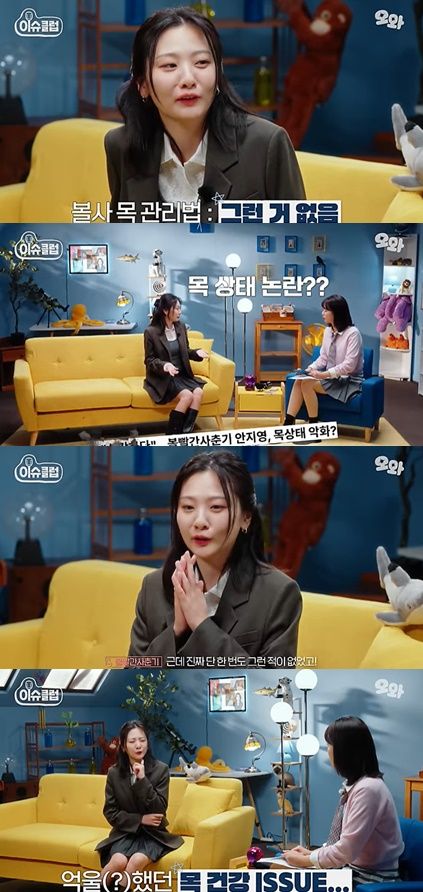 이에 안지영은 "목 관리를 따로 하지 않는다. 제가 잘하는 방법으로 노래를 한다"며 "그런 적이 있었다. 목 상태 논란. 근데 진짜 단 한 번도 그런 적이 없었다"고 목과 관련된 이슈를 언급했다.