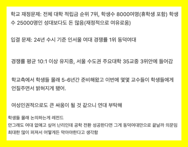 아니 동덕여대정도면 굳이 공학으로 바꿀이유가 없지 않음? 인서울에 이름만 들어도 알만한 여대인데, 보통 남졸업생들이 경제활동을 많이 하면서 학교에 기금을 많이 들여온다고 생각할 수 있을 것 같고 공학이 되어야 인서울 공학 메리트로 입결도 올라가고 입시 수입 (이거 엄청 큼) 도 증가한다고 생각하는 거 같고근데 학교에 기금 들어오는 거는 동문들도 있겠지만 그보다는 총장 비롯 학교 이사회 능력이라고 봄. 등의 반응을 보였다.