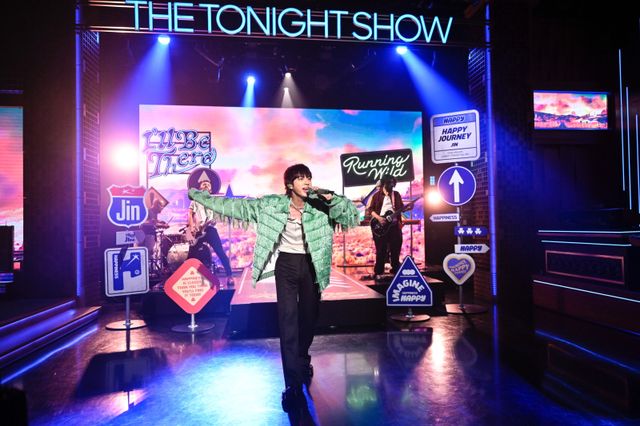 방탄소년단 진은 21일(이하 한국시간) 미국 NBC 인기 토크쇼 ‘더 투나잇 쇼 스타링 지미 팰런’에 출연했다. 진은 쇼의 호스트인 지미 팰런과 유쾌하게 이야기를 나눴고 미국 방송 최초로 솔로 앨범 ‘해피’의 타이틀곡 ‘러닝 와일드’ 무대를 선보였다.