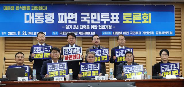 개헌연대가 주최하고 김용민 민주당 의원실이 주관하는 ‘대통령 파면 국민투표 토론회 : 임기 2년 단축을 위한 헌법개정’이 이날 서울 여의도 국회의원회관에서 열렸다. 이 자리에는 김 의원을 비롯해 박홍근, 강준현 민주당 의원과 황운하 조국혁신당 원내대표가 참석했다.