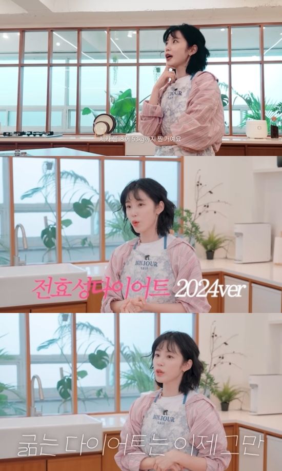 이날 영상에서 전효성은 "아직도 9년 전 '전효성 다이어트'가 돌아다니더라. 최근 업데이트된 제 다이어트 방법을 알려드리려 집이 아닌 스튜디오로 왔다"라며 본격적인 요리를 예고했다.