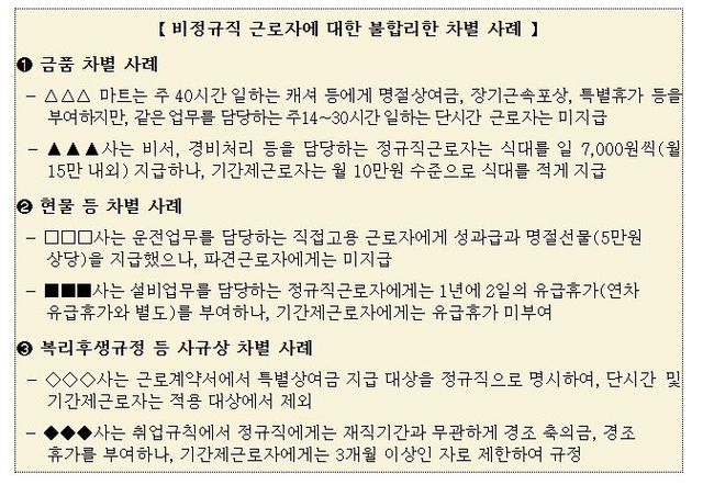 구체적으로 정규직과 동종・유사 업무에 종사하는 기간제・단시간・파견 근로자 등에게 합리적 이유 없이 ①식대・명절상여금 등을 지급하지 않은 금품 차별(18개소, 71백만 원), ②명절선물 등을 지급하지 않는 현물 차별(3개소) 등 적발된 사항에 대해 곧바로 시정 명령하여 전부 개선토록 했다.