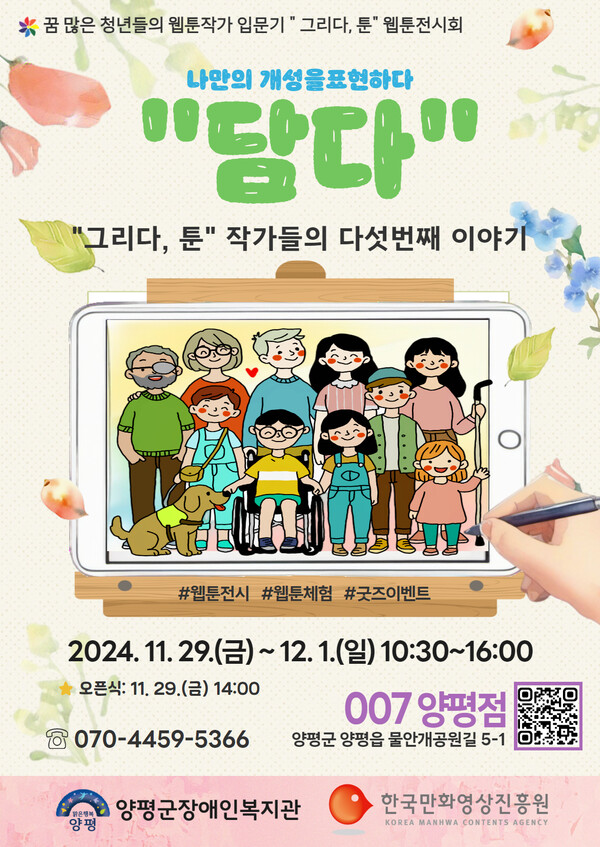 오는 29일부터 12월 1일까지 양평군장애인복지관이 ‘007 양평점’에서 “그리다, 툰” 수강생들의 전시회를 연다.