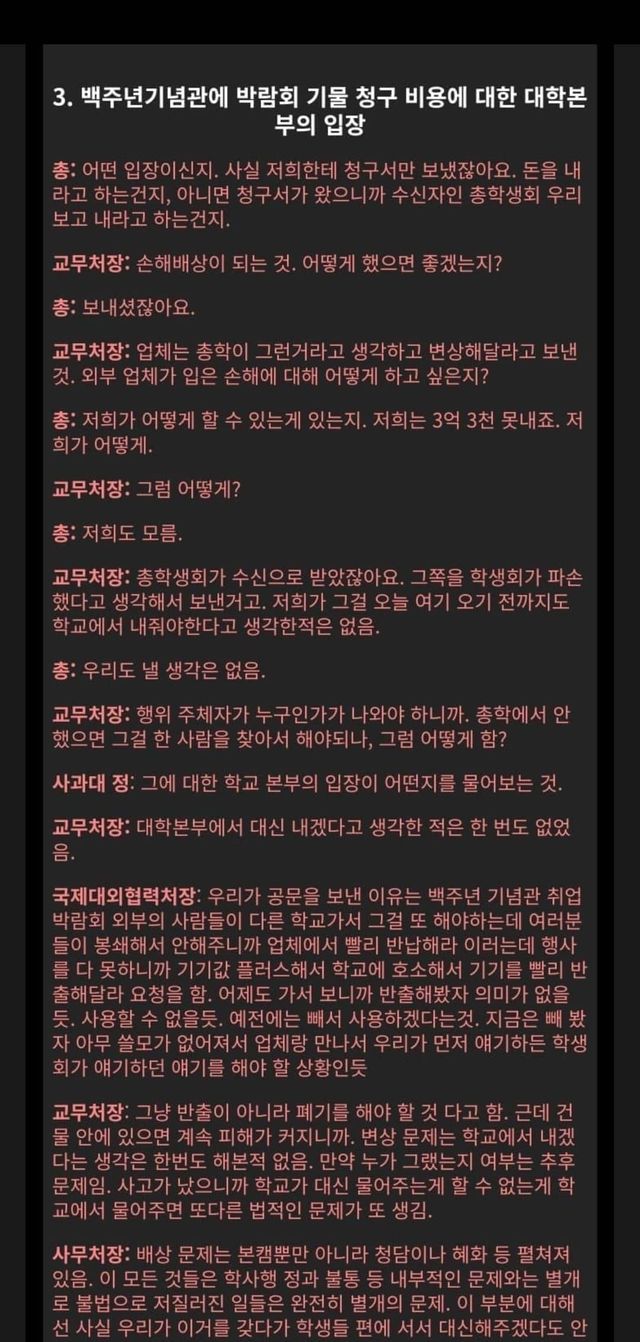 이어 교무처장은 "피해보상을 주장하는 주최는 백주년기념관 박람회를 진행하는 외부 업체이고, 그들은 총학생회가 총학생회에게 책임이 있다고 판단하여 변상해 달라고 요청하는 것이다. 외부업체가 입은 손해에 대해 어떻게 처리하고 싶냐?"라고 다시 물었다.