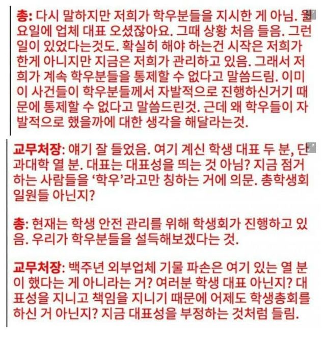 그러자 교무처장은 "말 그대로 손해배상이다. 어떻게 처리하면 좋겠는가?"라고 되물었고, 이에 총학생회장은 "당신들이 보낸 거잖아요"라고 답했다.