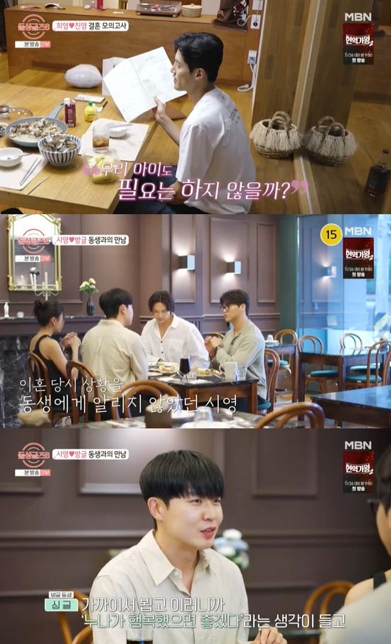 한편 시영, 방글 커플은 서로 동생을 소개해 주는 자리를 마련했다. 시영 동생은 조심스럽게 형의 이혼을 언급했다. 그는 "형이 이혼을 전혀 몰랐다. 얘기해주지 않았다. 그런데 보기만 해도 아는 게 있지 않냐. 당시에 많이 힘들어하고 의기소침했다"라며 당시를 회상했다.
