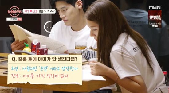 희영, 진영이 '결혼 고사' 문제집 답변에서 자녀에 관한 생각에 차이를 보여 눈길을 끌었다. 진영은 "우리 사이에 아기가 생기면 (지금 키우는) 애들한테 미안할 것 같아"라며 생각을 밝혔다.