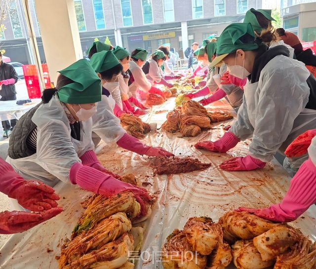 [투어코리아=김지혜 기자] 경기 군포시 광정동지역사회보장협의체(위원장 한미영)와 9개 직능단체는 21일 혹한기 대비 이웃사랑 김장담그기 행사를 갖고 있다. 이날 담근 김장김치는 저소득 취약계층 200가구에 5kg씩 전달했다.
