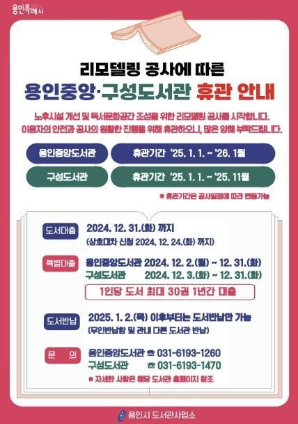 용인중앙도서관은 2026년 1월, 구성도서관은 2025년 11월 재개관을 목표로 리모델링이 진행된다.