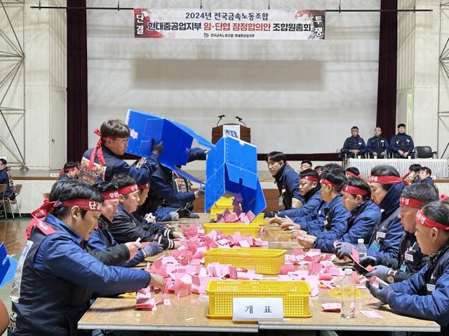 HD현대중공업 노조가 지난 21일 울산 본사 체육관에서 올해 임단협 2차 잠정합의안에 대한 조합원 찬반투표 기표 용지를 확인하고 있다. ⓒ HD현대중공업 노조