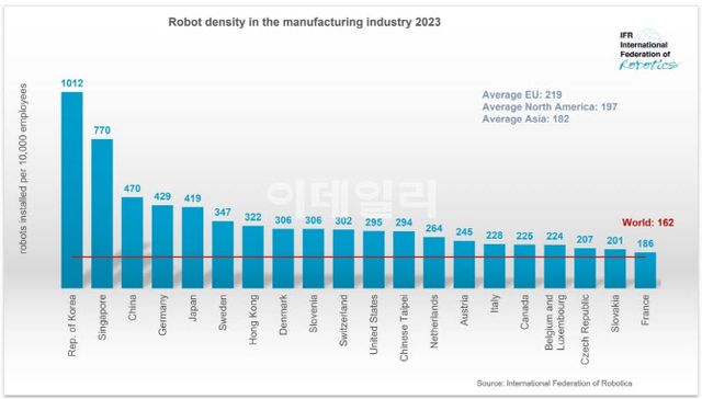 22일 국제로봇연맹(IFR)이 발표한 ‘세계 로보틱스 2024(World Robotics 2024)’ 보고서를 보면, 한국은 2023년 공장 근로자 1만명당 산업용 로봇 1012대로 사상 최고치를 기록했다.
