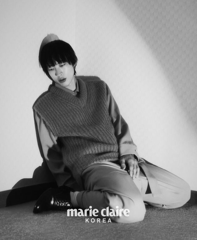 태민 핀스트라이프 재킷, 팬츠, 첼시 부츠 모두 Celine Homme.