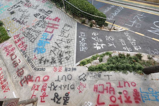 동덕여대 캠퍼스 바닥에 공학 반대 문구가 적혀 있다. / 연합뉴스