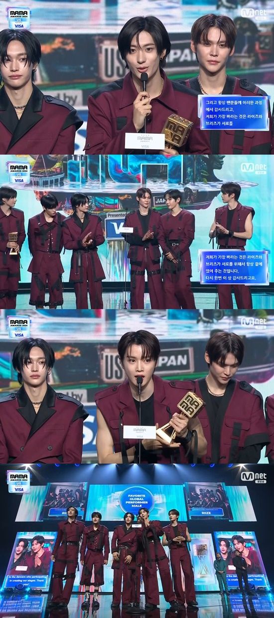 이날 라이즈는 글로벌 메일 퍼포먼스 부문을 수상했다. 앤톤은 먼저 영어로 수상 소감을 말하며 팬들과 스태프 및 소속사 식구들에게 감사인사를 전햇다.